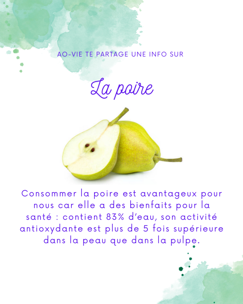 La poire agit sur l’estomac par conséquent, elle sera efficace si gastrite, ulcère, hyperacidité,…