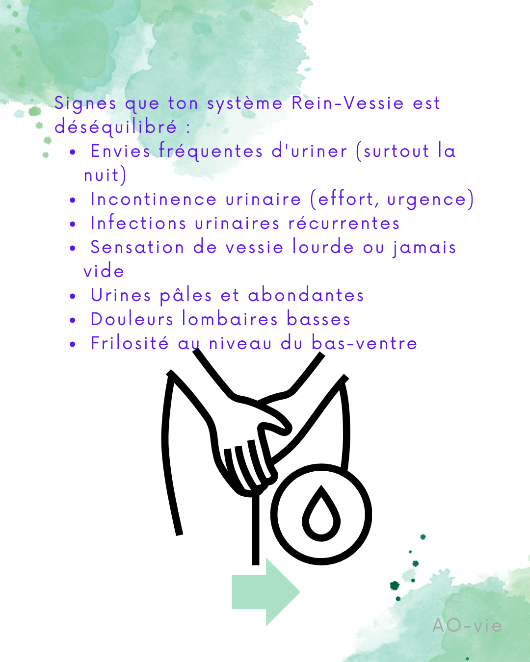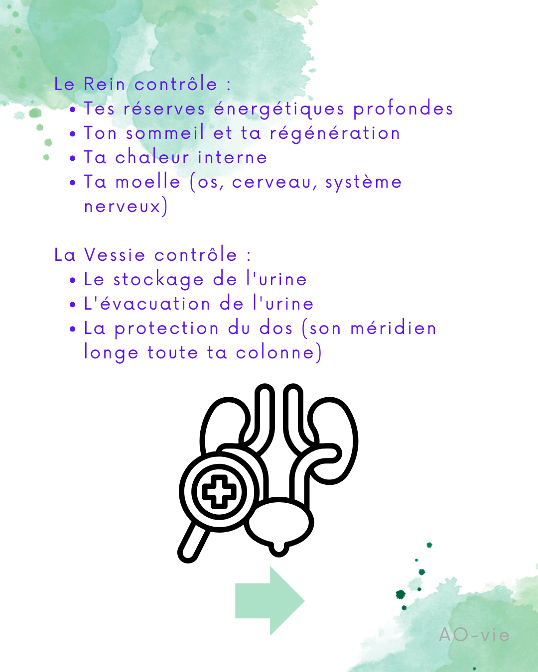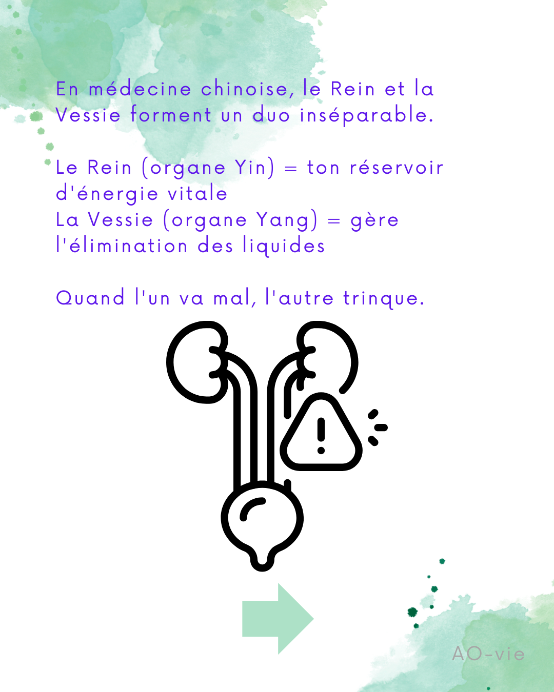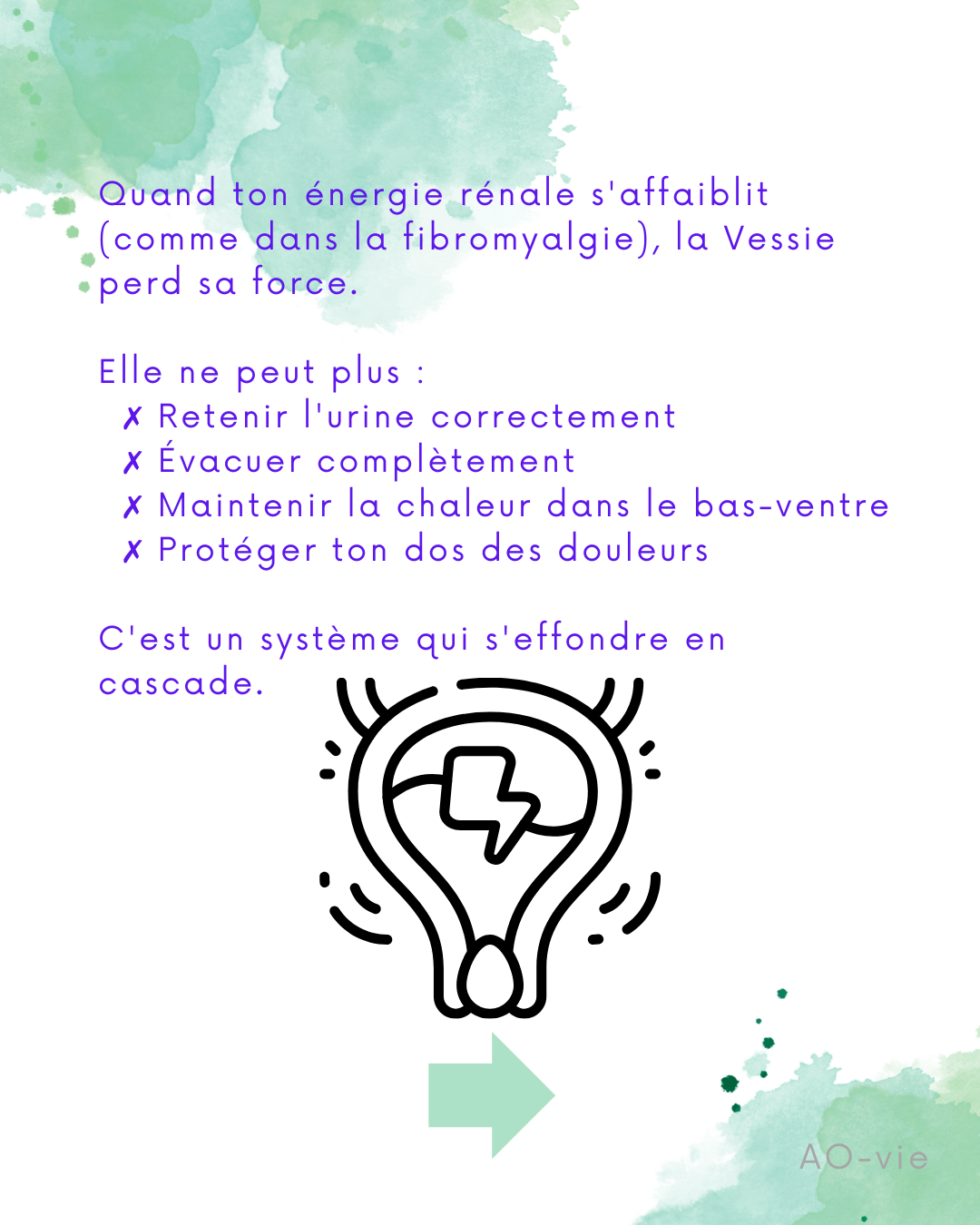 Quand ton énergie rénale s’affaiblit (comme dans la fibromyalgie), la Vessie perd sa force.