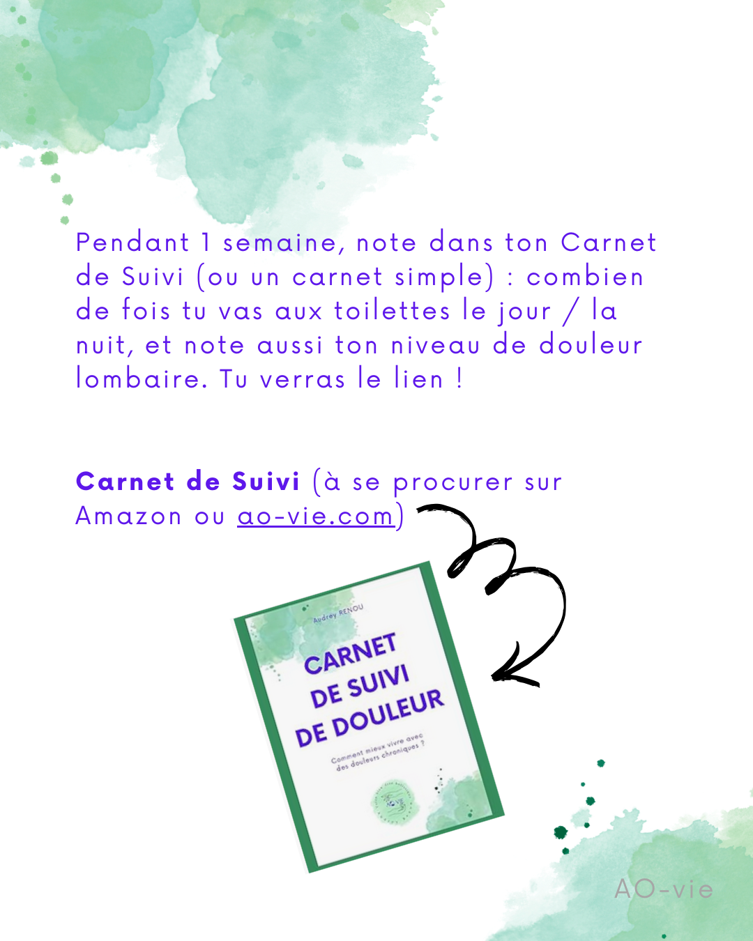 👉 Pendant 1 semaine, NOTE dans ton Carnet de Suivi (ou un carnet simple) : combien de fois tu vas aux toilettes le jour / la nuit, et note aussi ton niveau de douleur lombaire. Tu verras le lien !