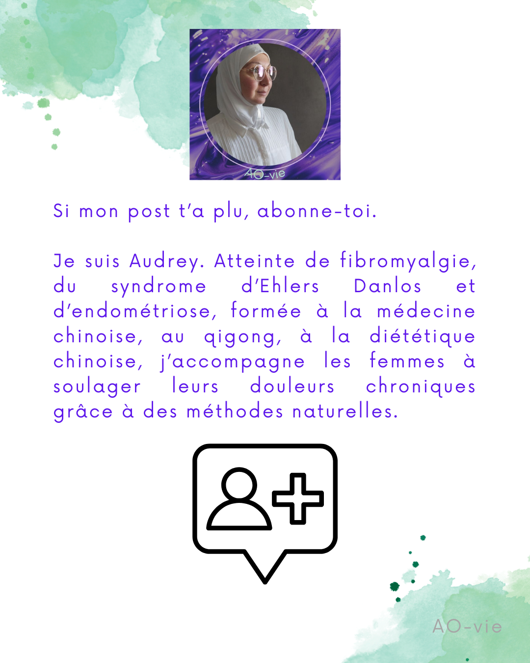 Je suis Audrey. 🧕 Atteinte de fibromyalgie, du syndrome d’Ehlers Danlos et d’endométriose, formée à la médecine chinoise, au qigong, à la diététique chinoise, j’accompagne les femmes à soulager leurs douleurs chroniques grâce à des méthodes naturelles.
