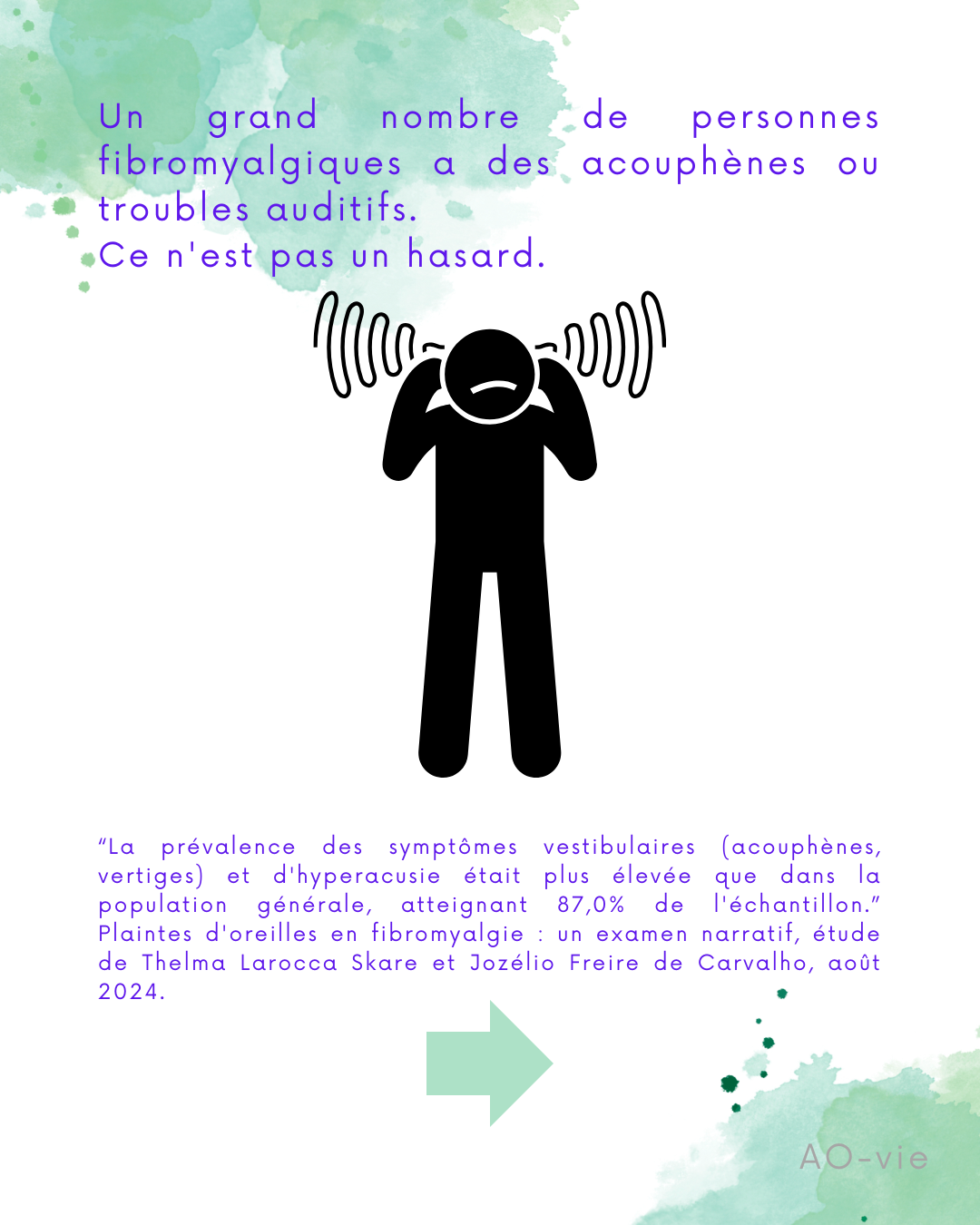 * Source PubMed : “La prévalence des symptômes vestibulaires (acouphènes, vertiges) et d’hyperacusie était plus élevée que dans la population générale, atteignant 87,0% de l’échantillon.” Plaintes d’oreilles en fibromyalgie : un examen narratif, étude de Thelma Larocca Skare et Jozélio Freire de Carvalho, août 2024.