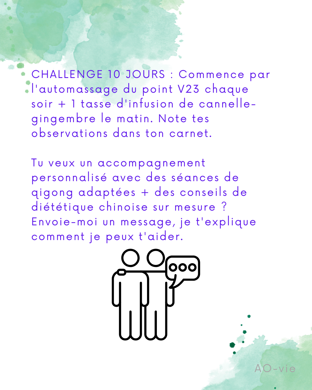 👉 CHALLENGE 10 JOURS : Commence par l’automassage du point V23 chaque soir + 1 tasse d’infusion de cannelle-gingembre le matin. Note tes observations dans ton carnet.