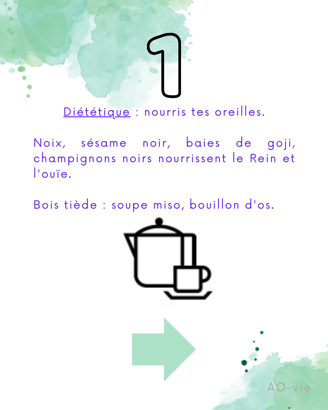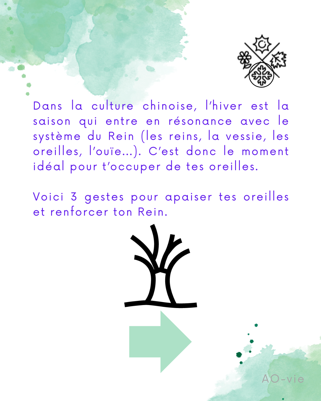 Dans la culture chinoise, l’hiver est la saison qui entre en résonance avec le système du Rein (les reins, la vessie, les oreilles, l’ouïe…). C’est donc le moment idéal pour t’occuper de tes oreilles.